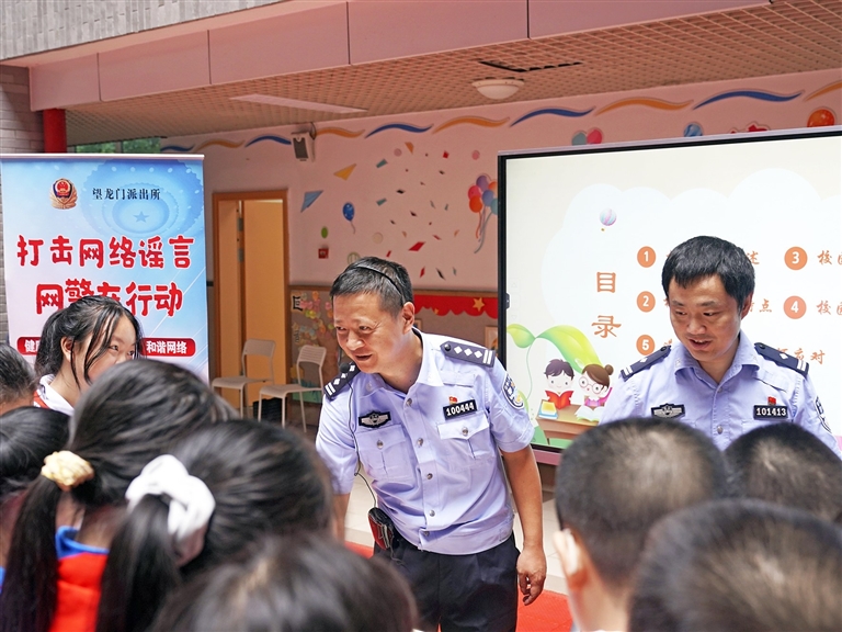 由渝中区委宣传部、渝中区公安分局牵头建设的“傅警官榜样工作室”也在望龙门小学揭牌成立。工作室以未成年人保护为宗旨,由曾荣获2023年第三季度“见义勇为”中国好人的望龙门派出所专职社区民警傅江丰领衔主理,与12名优秀小学教师、骨干公安民警、先进社区干部等组成复合型团队,为学生们及时提供法律援助、心理咨询等服务,希望以“榜样的力量”,促进构建社会各界广泛参与的未成年人保护网络。兼任学校法治副校长的傅江丰与该分局法制支队民警在现场共同带来一堂“反对校园霸凌”“拒绝网络谣言”的校园安全知识小课堂。