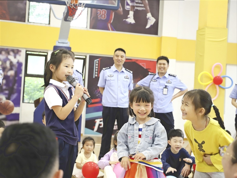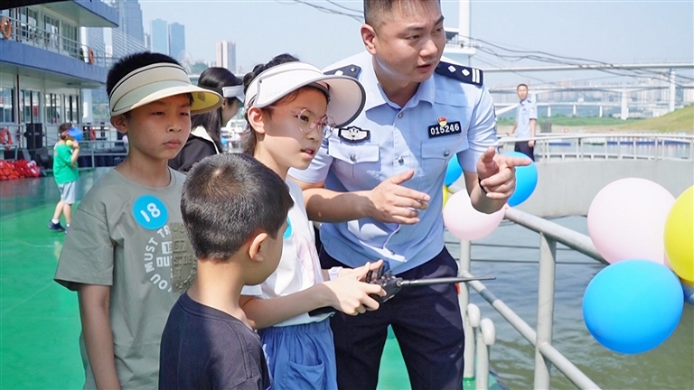 在“六一”国际儿童节来临之际,重庆水警总队开展了一场以水上安全为主题的“萌娃闯警营欢乐度‘六一’”青年志愿服务活动,用公安青年正能量,让少年儿童真切地感受节日氛围。当天在渝中区储奇门公安码头趸船,青年民警通过知识科普、装备展示、趣味游戏等寓教于乐的方式,为小朋友们带来一场别开生面的防溺水安全教育。