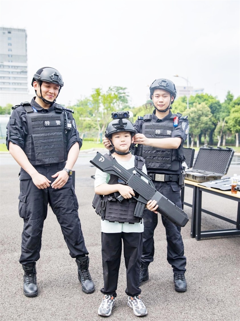 走进特警警营,隆化六小、文凤小学、区特殊教育学校的学生代表就被警用武器装备深深吸引,特警以实物展示、现场解说、参与互动等方式,带着小学生们参观内务整理、警用武器装备、队列擒敌拳、反恐防暴装备,并为他们讲解盾牌、钢叉、枪械、无人机、防护器具的使用场景,邀请孩子们上前体验如何使用这些装备,一件件装备、一个个真枪实弹引得学生好奇不断。活动最后,特警还向小学生们讲解了防火、灭火等安全知识,现场演示了灭火器使用方法,进一步提升学生们安全防范意识和应对火灾事故能力。