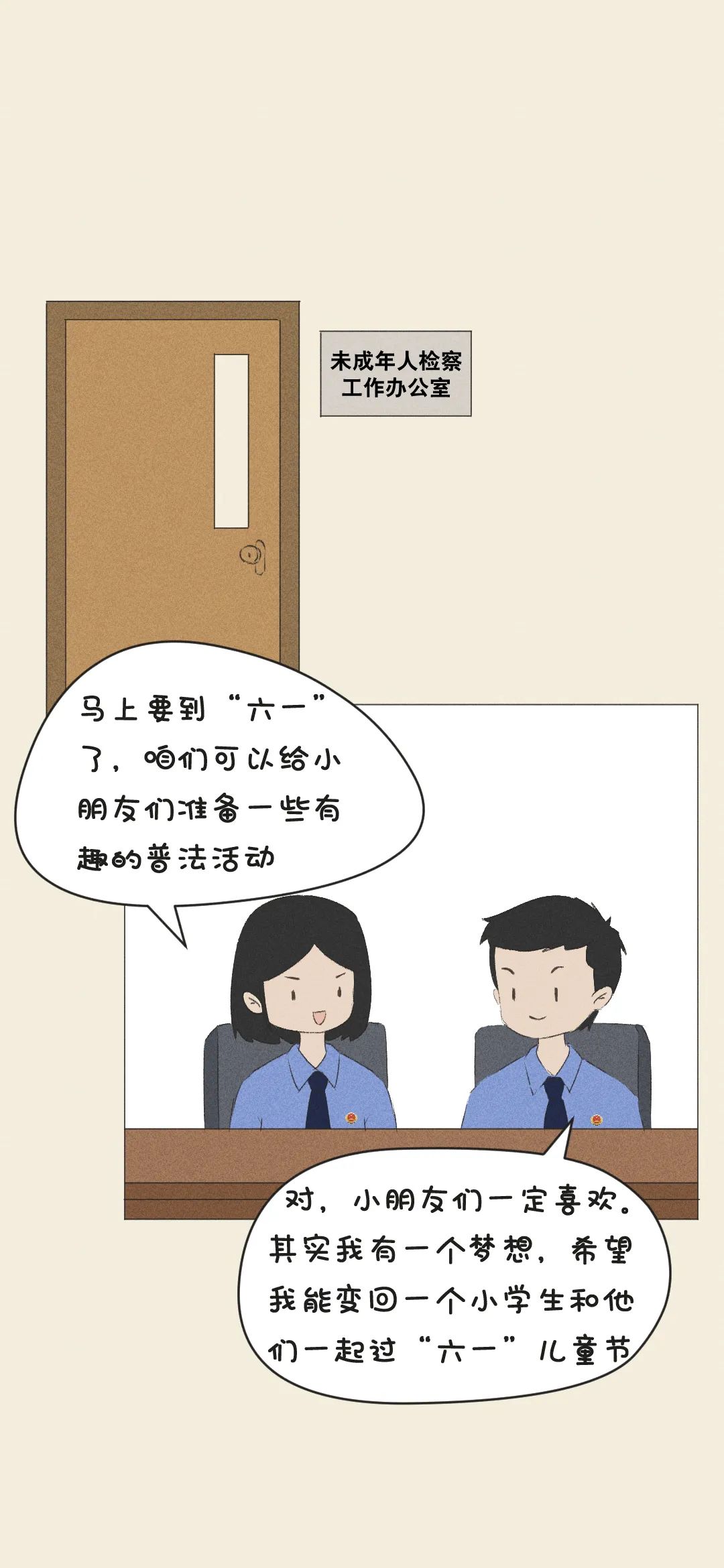 “马上要到‘六一’了,咱们可以给小朋友们准备一些有趣的普法活动”,“对,小朋友们一定喜欢,其实我有一个梦想,希望我能变回一个小学生和他们一起过节”,重返校园过“六一”,检察官这个梦想实现了吗?