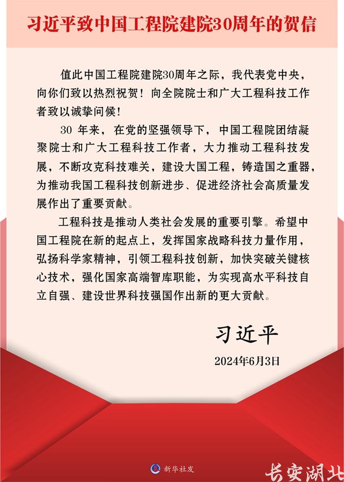 新华社北京6月3日电在中国工程院建院30周年之际,中共中央总书记、国家主席、中央军委主席习近平发来贺信,代表党中央致以热烈祝贺,向全院院士和广大工程科技工作者致以诚挚问候。