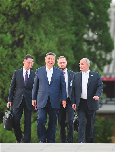 习近平在瀛台桥前迎接普京。两国元首边走边谈,看亭台楼榭,赏万物并秀。