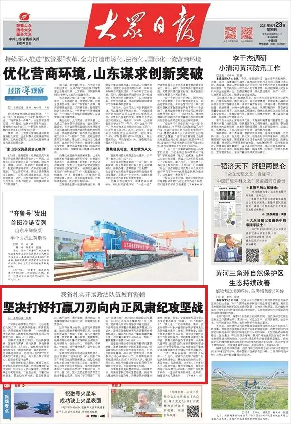 5月23日、24日、25日,省委机关报《大众日报》连续三期刊发我省政法队伍教育整顿扎实推进的相关新闻报道,记者分别以“坚决打好打赢刀刃向内正风肃纪攻坚战”、“教育整顿聚警心 办好实事暖民心”、“开门整顿再出实招 亮出家底直面'挑刺儿'”为题从学习教育、查纠整改、开门整顿、“我为群众办实事”等角度,全面立体地报道了全省政法队伍教育整顿的相关情况,通过媒体的视角“看教育整顿”,通过记者的笔尖、镜头展示教育整顿实效,助推全省政法队伍教育整顿走深走实。