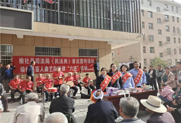 5月24日,榆社县司法局民法典普法讲法小分队联合盲人曲艺队到文景苑移民小区,开展以“美好生活·民法典相伴”为主题的普法讲法活动。盲人曲艺队以群众喜闻乐见的快板、“三句半”等形式,将民法典中与群众生活息息相关的内容编成朗朗上口的榆社“土话”,进行说唱。普法讲法小分队深入群众家中,为行动困难群众面对面进行法律咨询。共发放民法典等法律六进小册子1000余册,法治宣传生活用品300余件,解答法律问题10余户。