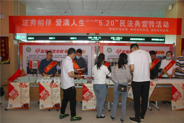 5月20日,晋城市司法局联合泽州县民政局、泽州县司法局,以民法典颁布一周年为契机,在泽州县政务中心联合开展了“法典相伴 爱满人生”民法典主题宣传活动。活动现场,工作人员为每一对前来领证的新人发放了民法典,并向新人及办事群众宣传普及了民法典知识,重点解读了婚姻家庭、继承、物权、合同等与日常生产生活息息相关的内容。此次活动全市六县(市、区)同步进行。