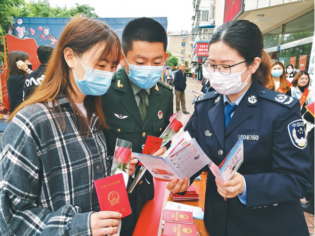 5月是民法典宣传月。明光市明光街道司法所工作人员走进婚姻登记处,向前来登记的新人普及民法典知识,引导他们依法维护自身合法权益。