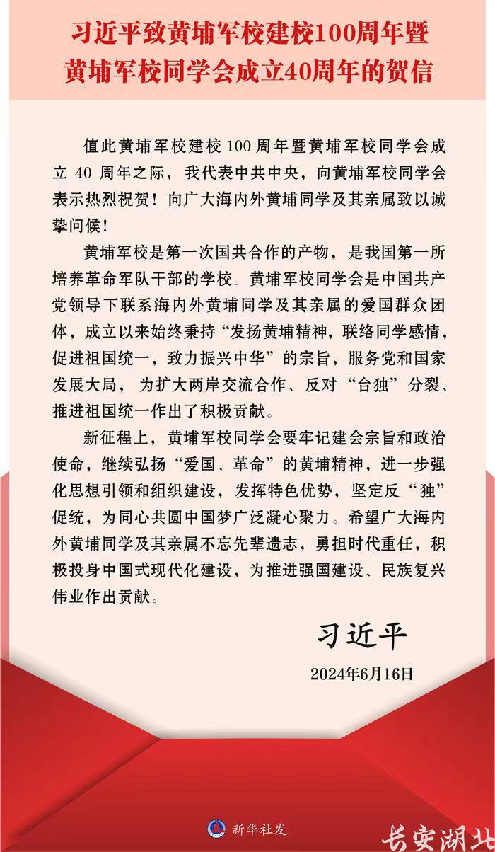 新华社北京6月17日电在黄埔军校建校100周年暨黄埔军校同学会成立40周年之际,中共中央总书记、国家主席、中央军委主席习近平发来贺信,代表中共中央向黄埔军校同学会表示热烈祝贺,向广大海内外黄埔同学及其亲属致以诚挚问候。