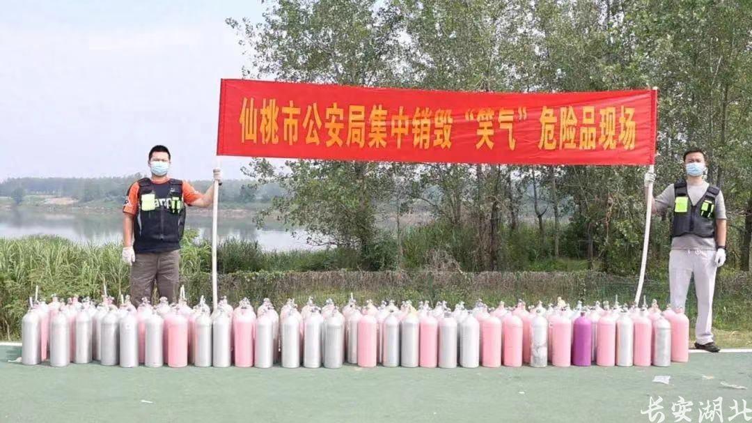 这批“笑气”是仙桃警方近年来在案件办理中缴获的其所关联的案件,均已超过行政案件的复议、诉讼期限。根据相关规定予以依法公开销毁。