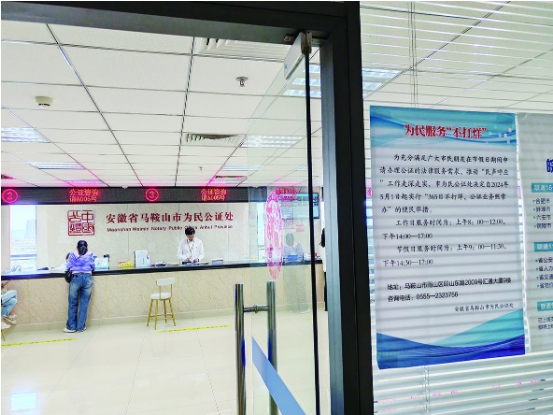 走进雨山区印山东路汇通大厦9楼的马鞍山市为民公证处,可以看到醒目的“为民服务‘不打烊’”公示牌。公示牌上清晰地显示出工作日服务时间为8:00—12:00,14:00—17:00,节假日的服务时间为9:00—11:30,14:30—17:00,并附有咨询电话。