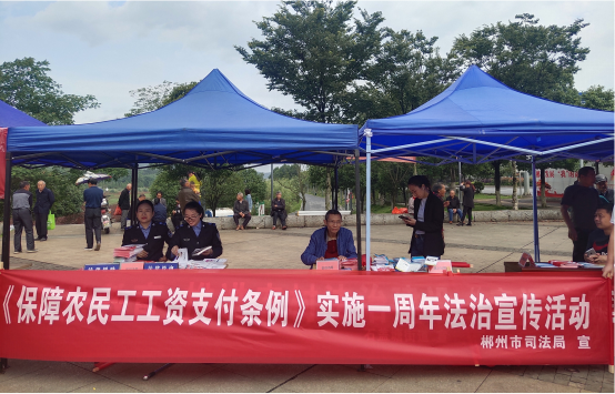 郴州市守法普法工作办公室联合北湖区司法局,组织区人社局、区市场监管局等职能部门深入基层开展送法下乡活动,向群众宣传涵盖劳动保障、工伤保险、工资待遇保障等方面的法律知识,为农民工介绍申请法律援助的条件和渠道,引导农民工用法律武器保护自身合法权益。市仲裁委到郴建集团和马上银商务公司宣传仲裁制度,多角度大力开展助企普法宣传活动。市福城公证处深入到嘉禾县、安仁县等地开展上门公证服务和普法活动,边服务边普法,极大地方便了因身体原因或者住在边远地区不便到办证服务中心办理公证的群众,同时让群众边办事边学法。