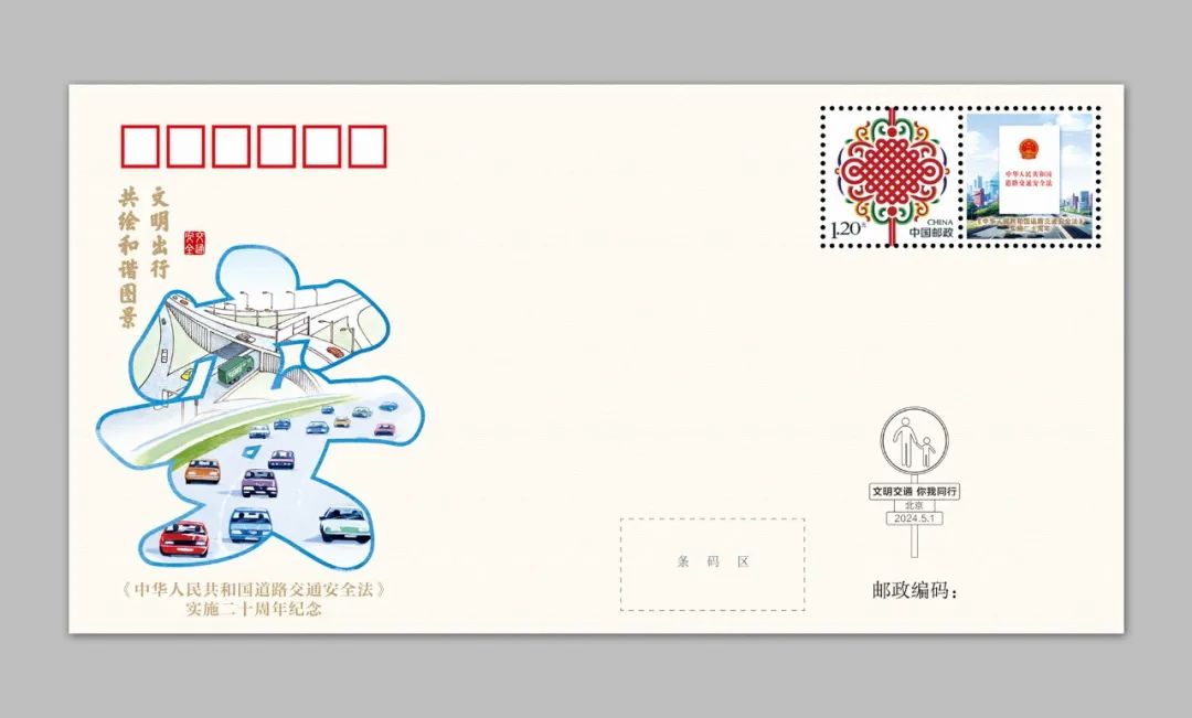 至2024年5月1日,《中华人民共和国道路交通安全法》将迎来实施20周年纪念日。20年间,我国机动车驾驶人数量从0.75亿人增长到5.23亿人,机动车保有量从1.07亿辆增长到4.35亿辆,快速行进在汽车社会的广阔道路上。《中华人民共和国道路交通安全法》纪念邮品包括纪念封一套两枚,分别名为“文明出行 共绘和谐图景”和“法治护航 共建平安大道”。纪念封采用米色色调,以“安”字作为核心元素,字体内部用手绘方式展现了城市和乡村道路交通安全场景。邮票主图是《中国结》个性化邮票,附图是《中华人民共和国道路交通安全法》封面,背景分别展现了城市文明交通和乡村锦绣山河。
