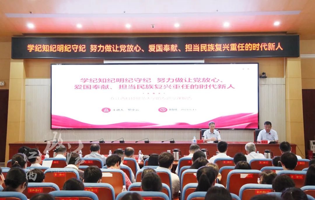 6月13日,省委常委、省委政法委书记罗小云在其所联系的江西科技师范大学作专题党课报告,勉励青年学生切实把思想和行动统一到习近平总书记和党中央决策部署上来,争当学纪知纪明纪守纪的时代新人,努力在全面推进强国建设、民族复兴伟业中贡献青春之智慧、青春之力量。 罗小云以“学纪知纪明纪守纪 努力做让党放心、爱国奉献、担当民族复兴重任的时代新人”为题,围绕“深刻悟,在认识上见高度”“ 踏实学,在把握上见精度”“切实行,在落实上见力度”三个方面,系统阐释了开展党纪学习教育的深层逻辑,并与广大师生一起重温新修订的《中国共产党纪律处分条例》,和大家探讨如何更好地把遵规守纪刻印在心、内化为日用而不觉的言行准则,做到知敬畏、存戒惧、守底线。 罗小云指出 加强纪律建设是全党统一意志、统一行动、步调一致前进的重要保障,必须常抓不懈。学纪是知纪明纪守纪的前提先导,必须真抓实学。学纪知纪明纪最终是要规范和约束党员干部严严实实、本本分分守纪,必须狠抓执行。他强调,要凝聚思想共识,集聚行动合力,以高度政治自觉把党纪学习教育抓紧抓实;突出学习重点,推动入脑入心,更加坚定自觉用党规党纪校正思想和行动;践行纪律要求,严格自身言行,真正体现出党员的先进性和纯洁性,争做政治过硬的忠诚信仰者、纪律过硬的模范守纪者、道德过硬的价值引领者、本领过硬的担当有为者。 专题党课报告后,罗小云还听取了该校关于党纪学习教育、平安校园建设、全面依法治校等工作的汇报。 |