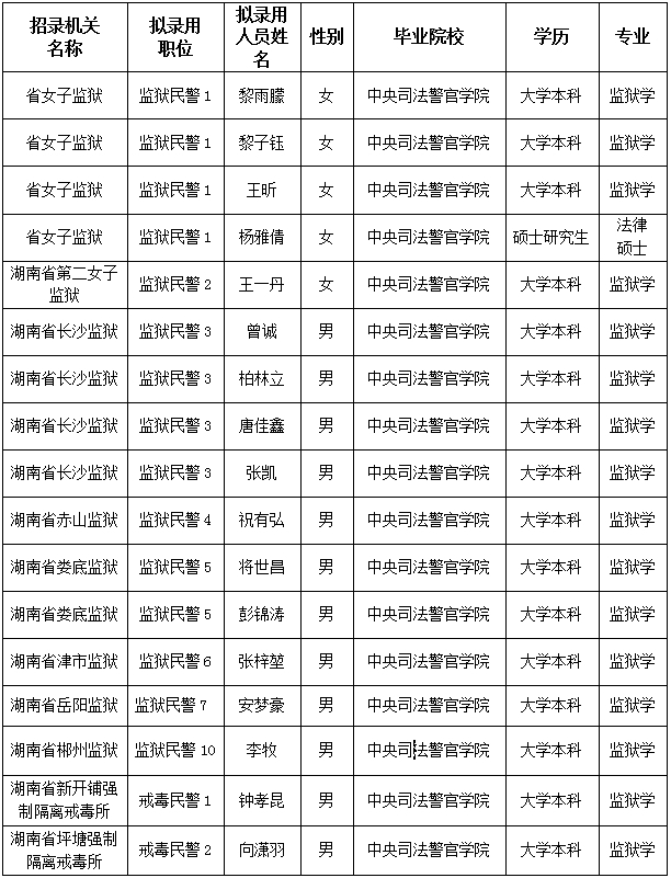 湖南省司法厅2024年面向中央司法警官学院司法行政警察类专业应届毕业生考录人民警察拟录用人员名单公示