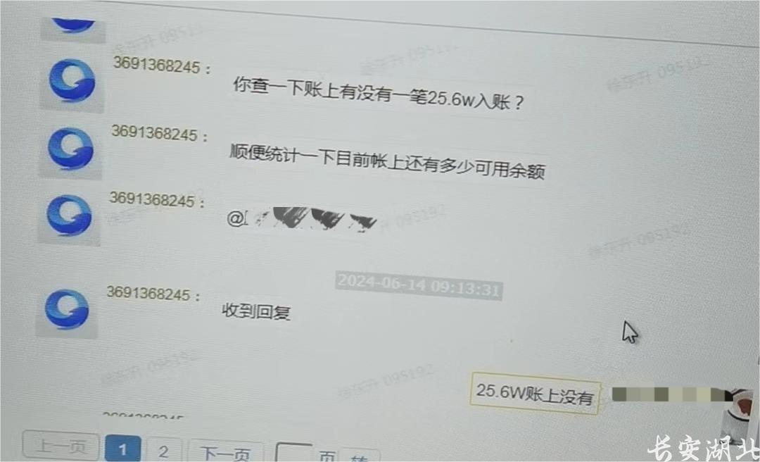 随后,“老板母亲”夏某在群中询问蒋某,“公司账上是否有一笔25.6万元入账?账户还有多少余额?”蒋某如实告知夏某并未收到这笔转账,账户内目前还有300余万元余额。“老板”魏某在群里回复,“转款没有那么快到账。”并在群里给蒋某发送了一个账户,要求其向该账户转付工程款216万元。