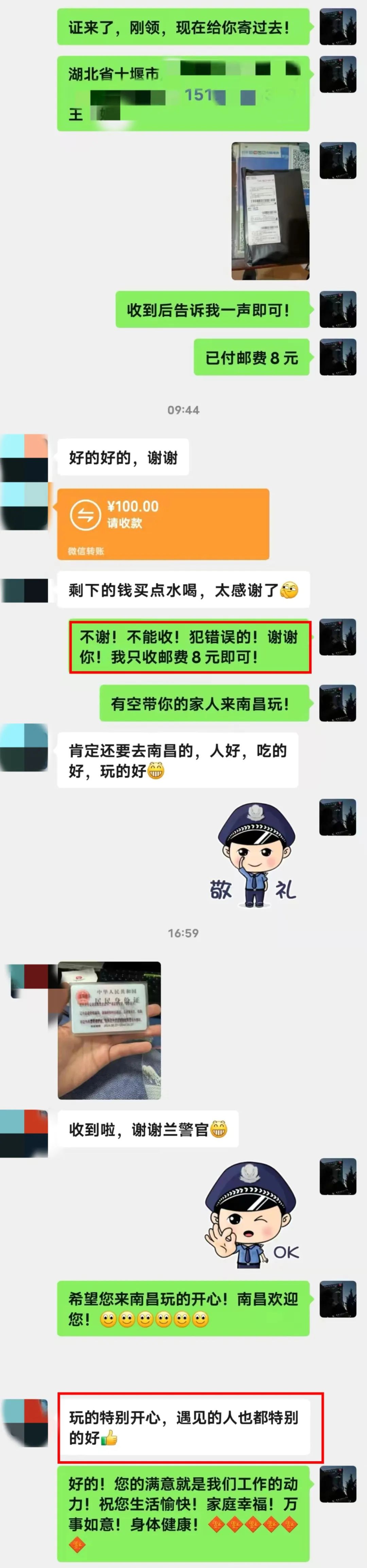 近日 南昌市公安局西湖分局 广润门派出所 收到一面来自湖北十堰 王女士的锦旗 赞誉英雄城之行体验好 英雄城的人更好 道出了一段 辅警800公里邮寄身份证的故事 “我的身份证掉了,可以帮我补办一下吗?” 日前,湖北省十堰市的王女士在南昌旅游期间,不慎遗失了身份证。她担心无法乘坐高铁回家,更担心身份证被不法分子捡到后会用于贷款或其他不法行为,便来到广润门派出所求助。 从警30多年的老辅警兰华明 以一贯的热情和耐心 安抚王女士 告知她仅凭一张身份证 是无法冒充他人 进行贷款的 在没有身份证的情况下 可以通过 手机“铁路12306”App 办理电子临时身份证回家 老兰温馨的话语 让王女士安心了一些 随后 老兰还细心指导王女士 在派出所办理了身份证挂失手续 因身份证补办制证时间较长 王女士决定先回湖北 等身份证办理好后 再来派出所领取 “不用这么麻烦,身份证补办好后,我给你寄过去,免得你再跑一趟!” 为了不让王女士多跑 老兰主动提出 帮忙将身份证寄送过去 这让王女士感到欣喜万分 办理完身份证补办手续后,王女士加了老兰的微信,并向老兰道别。老兰一直将这件事情放在心上,每日跟进身份证办理进度。 14天后,老兰终于拿到了王女士补办好的身份证,他利用下班时间,去小区的驿站将身份证寄给王女士。 “(我在南昌)玩得特别开心,遇见的人也都特别好!” 收到在异乡办理的身份证,王女士感动不已,发自内心地感慨道,并通过微信转账100元给老兰以表谢意。 但老兰婉拒了她的红包,只收了8元邮寄费,并欢迎王女士再来南昌游玩。 几天后 广润门派出所 收到王女士寄来的一面锦旗 对辅警兰华明 表示衷心感谢 一张小小的身份证 一份浓浓的爱民情 无论何时何地 英雄城公安 一路相随 |