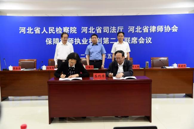 会议由省司法厅副厅长霍建明主持。省检察院副检察长赵智慧与省律师协会会长张金龙分别代表省检察院与省律师协会会签了《河北省人民检察院河北省律师协会关于侵犯律师执业权利控告申诉案件线索移送工作办法(试行)》。张金龙介绍了全省律师工作开展情况,各位律师代表结合工作实际就构建新型律检关系、加强执业权利保障等提出意见建议。