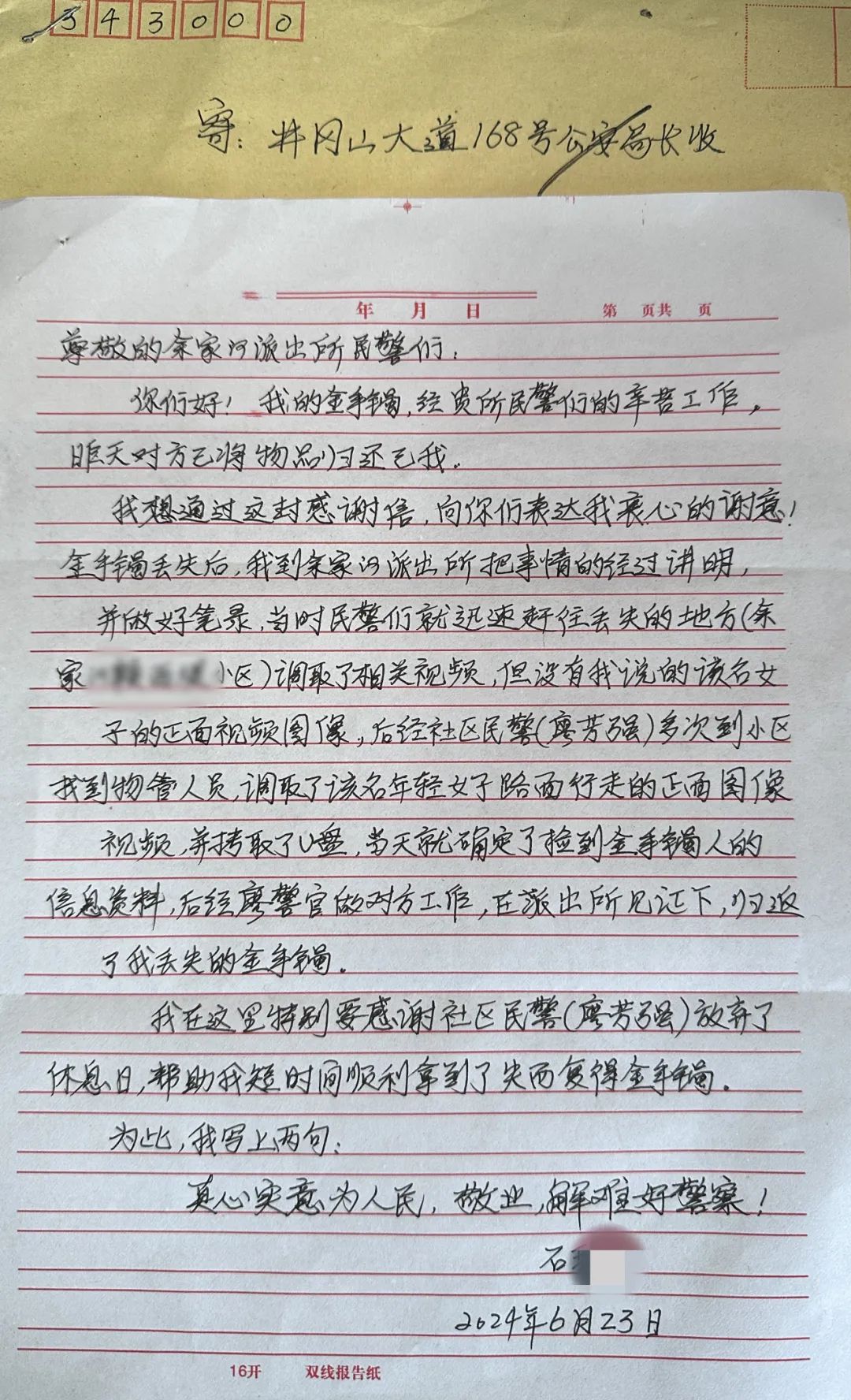 近日 家住吉安市吉州区城南的石氏夫妇 急匆匆地来到余家河派出所报警 称前一日在其小区 不慎遗失了一只足金手镯(39.03克) 价值两万余元 ▲石女士所遗失的足金手镯 接到报警后 余家河派出所民警廖芳强与辅警 迅速赶往现场 一边安抚石女士情绪 一边详细了解事情经过 及其当天活动轨迹 随后立即开展工作 ▲民警查看小区监控视频 据石女士描述 其当天与爱人在小区楼下散步时 手腕上还戴着手镯 等到上楼时 却突然发现手镯不翼而飞 民警廖芳强 一边组织物业、网格员 在石女士活动区域及周边 展开地毯式搜寻 一边调取小区监控 ▲监控视频内发现关键线索,一女子有弯腰拾捡动作 经过不懈努力 民警发现在事发时段 一女子有弯腰拾捡动作 根据这一关键线索 民警很快锁定目标 沿途追踪分析 最终锁定该女子身份 并与之取得联系 在民警的真诚沟通与耐心劝说下 女子主动将手镯归还 遗失的金手镯“完璧归赵” 见到金手镯失而复得 石女士欣喜万分、百感交集 ▲石女士所寄出的手写信 6月23日 市公安局吉州分局局长 收到一封手写感谢信 字里行间饱含了石女士 对民警廖芳强的感激之情 对吉州分局民辅警 办事效率和专业水平的认可 淡墨素笺 纸短情长 字字滚烫 为民警廖芳强点赞 为余家河派出所民辅警点赞! |