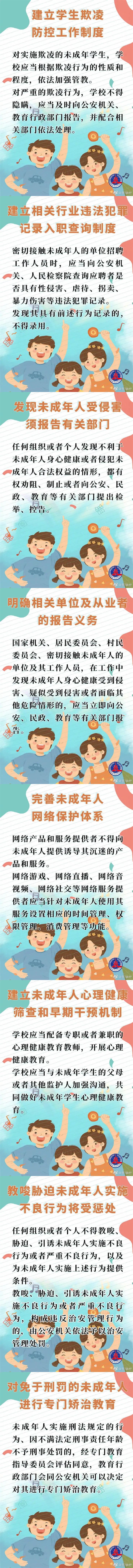 《中华人民共和国未成年人保护法》修订案经十三届全国人大常委会第二十二次会议表决通过,自2021年6月1日起正式施行。修订后的未成年人保护法提出的“六大保护”中,家庭保护仍然处于首位,其中明确规定了父母或者其他监护人应当履行的十项监护职责,同时也规定了十一项禁止行为。 第十三届全国人民代表大会常务委员会第二十四次会议表决通过《中华人民共和国预防未成年人犯罪法》修订草案,该法律自2021年6月1日起正式施行。新修订的预防未成年人犯罪法明确,任何组织或者个人不得教唆、胁迫、引诱未成年人实施不良行为或者严重不良行为,以及为未成年人实施上述行为提供条件;未成年人的父母或者其他监护人对未成年人的预防犯罪教育负有直接责任;教育行政部门应当会同有关部门建立学生欺凌防控制度。