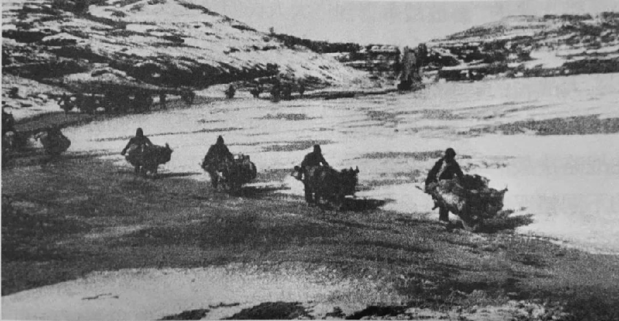 三大战役期间,解放区农民在冰天雪地中用小车把弹药、物资运往前线。图片来源:《中国共产党的九十年》