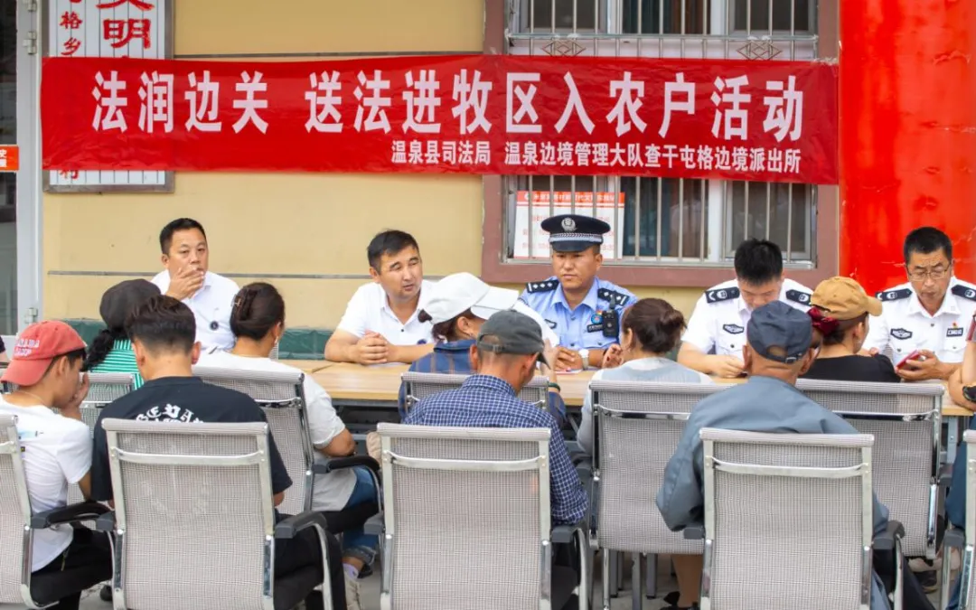 6月27日,温泉县司法局联合温泉边境管理大队查干屯格边境派出所、爱博律师事务所等单位组织开展“法润边关 送法进牧区入农户活动”,由司法干警、派出所民警、律师等十余名同志组成的“法治班车”法律咨询服务队,为温泉县查干屯格乡各村队、牧场的农牧民群众上门提供法律咨询服务。