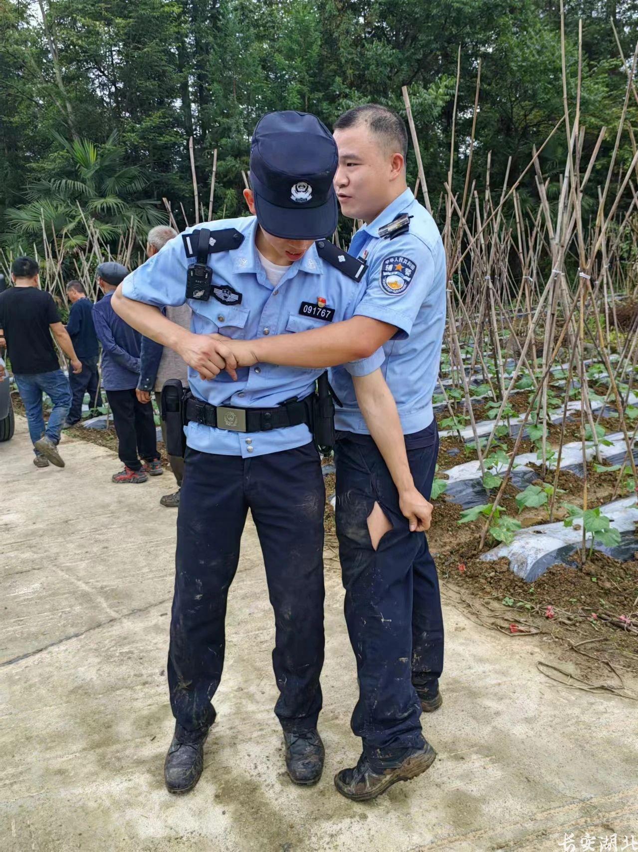 在紧要关头,有村民提议,有条山路可以绕行下山进入“天坑”底部。民辅警、医护人员遂带上担架,沿泥泞山路步行1.5公里左右,抵达底部。