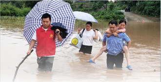 图① 近日,湖南省泸溪县公安局浦市派出所辅警与村干部转移被困群众。王文良 摄