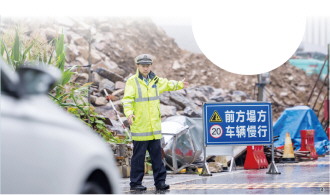 图② 近日,湖北省长阳土家族自治县公安局高家堰派出所民警冒雨在辖区道路塌方维修路段执勤,提醒过往车辆减速慢行,确保通行安全。记者 刘欢 通讯员 胡灿 摄