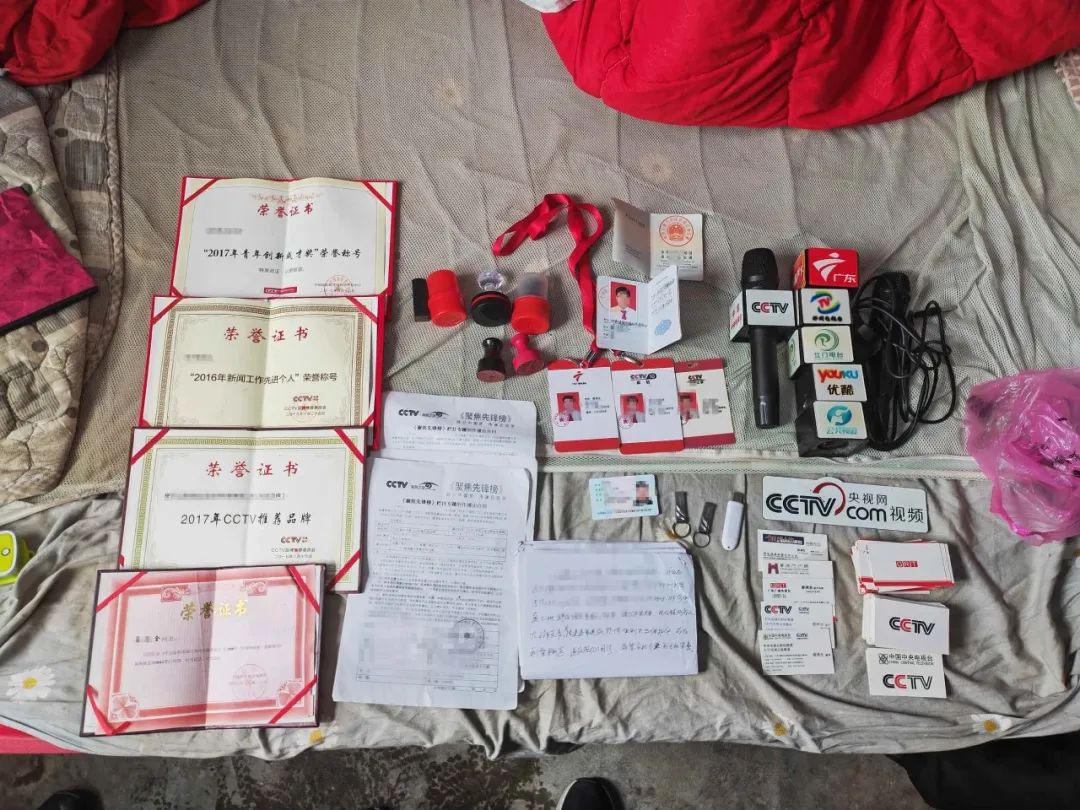 不久前 会昌警方辗转湘粤川赣四省二十余地市 经过缜密侦查 成功破获假冒“央视编导”诈骗系列案件 随着“李鬼”蔡某全的落网 警方揭开了其行骗内幕 ...... 事发东窗,“央视”编导落网 今年2月中旬,会昌公安及会昌网信部门在工作中获得一条线索:有几名男子自称是“央视”工作人员,在会昌、赣县等地进行采访活动,而后收取相关个人和单位费用,有诈骗犯罪的重大嫌疑。获悉情况后,会昌警方高度重视,积极协调各有关部门进行核查,同时就线索指向的受害人进行调查。 ▲嫌疑人在网络上发布的挂有央视栏目标识的视频 经过详细的调查,侦查人员发现男子蔡某全纠集他人假冒“央视编导”,利用帮助采访宣传、推广合作为噱头,骗取他人钱财,范围竟然涉及多个省份。为深挖犯罪,维护广大人民群众利益,会昌警方成立专案组,组织精干警力奔赴湖南、广东、四川、江西等省市。侦查人员克服重重困难,转战二十多个市县区,最终获得了蔡某全实施诈骗犯罪的大量证据。今年3月上旬,会昌警方对蔡某全实施抓捕行动,在大余警方的大力协助下,成功将主要犯罪嫌疑人蔡某全抓获到案。 犯罪嫌疑人蔡某全落网后,面对警方的讯问和大量的证据,自知无法抵赖隐瞒过关,遂供述了自己招募技术人员,购买假冒证件,而后利用假冒的“央视编导”身份,进行诈骗敛财的犯罪事实。 ▲民警查获的涉案物品 租住陋室,穷尽办法包装 在大余县某镇,有一座废弃的村小教学点。该教学点地处偏僻,院内杂草从生,但就在这里,蔡某全却租住了一间属于自己的办公室。侦查人员根据蔡某全的供述找到了这个地方。 ▲蔡某全的办公室位于该教学点院内 在该教学点内一幢两层的楼房内,民警推门进入蔡某全的办公室,发现室内十分简陋,但墙上却整齐地挂着蔡某全与多位所谓社会各界“名人”“大腕”的合影,以及各式各样的牌匾。一张张与“名人”的合影,一块块闪着金光的荣誉牌匾,似乎折射出这位“央视编导”的“不同凡响”。 不仅如此,侦查人员在蔡某全的家---几间普通红砖砌成的平房内,也有重大发现。在一间狭小的卧室内,民警依法查获了蔡某全作案用的电脑、记者工作证件、话筒、央视标志话筒台标、CCTV标识合同书、央视各栏目印章、U盘、名片、荣誉证书,琳琅满目的作案工具几乎摆满了一整张床。 ▲在蔡某全家中卧室缴获的作案道具、物品 “除了我自己的名字和上学时的那一本证书是真的以外,其余的都是假的...”面对民警的提问,蔡某全这样说道。 ▲蔡某全请人制作的发给客户的假牌匾 据蔡某供述,为了让客户不起疑心,他请人在外省私刻了5枚央视各栏目的“公章”,在网上搜来合同书涂涂改改,从市场上买来话筒,又叫人制作了假的CCTV标识的台标套在话筒上,还制作了几个栏目的“工作证”,所有的费尽心思,都是为了让自己更加符合“央视编导”的形象进行的包装。至于获奖证书,是蔡某全自己颁发给自己的;那些牌匾,也是蔡某全在街边广告店做的,几块发给自己,其他的用于拍摄视频后颁发给业务客户的。据蔡某全供述,给客户发牌匾,一来能让人家更信任自己,二来能给客户带来更好的生意和形成更大的影响... ▲蔡某全请人制作的假证件 沉浸角色,终成自欺欺人 据警方调查,蔡某全大学毕业后,曾在某地方媒体的下属公司做过临聘人员,几年下来对媒体采访的模式流程比较熟悉,也感受到了记者--“无冕之王”的魅力。被解聘后,蔡某全便动起假冒央视记者敛财的歪心思,遂买来各种采访需要的道具,租赁并布置好办公地点...经过一系列的精心包装之后,蔡某全就成为了一名“央视编导”。 ▲蔡某全在市场上购买的假证件 随后,他大胆往来于湘粤川赣四省多地,瞅准县城小众生活的美食、美景,设法找到当地特色美食店主、景区老板、大小企业主等,以“央视资深编导”身份夸夸其谈,极力鼓吹自己的能力。在与客户谈拢价格、签订假合同后,蔡某全就指挥聘用人员进行采访拍摄活动,范围涉及各地美食、景点以及酒类等。在制作好相关文章、视频后,再挂上伪造的CCTV标识,在各类小众媒体、网站等平台上发布。当每一单“生意”做完之后,他就凭借这些制作的图文、视频的链接、截图等,向客户索要收取费用。 ▲网络中蔡某全团队制作并发布的视频 “我是央视编导......”尽管被抓,在审讯室里面对民警的提问,蔡某全依然固执己见,沉浸在自己编织的“编导”角色里难以自拔,依然跟民警纠结记者与编导的区别。然而,真的假不了,假的真不了。蔡某全的所有狡辩,在大量的事实和证据面前,都显得那么苍白无力。 ▲蔡某全的电脑中保存的假冒央视栏目各种标识 在蔡某全的电脑中,警方还发现很多假冒的央视台标文本图片、各类制作好的视频存档,以及一些措辞精美的涉案文案。极具讽刺意味的是,明明知道自己是假的“编导”,但蔡某全却已经完全“入戏”,他不但注册了自己的公众号,发布制作好的特色美食美景视频,还在多篇文章中以著名诗人、散文家自居,自己书写文案文章,自己编辑发布,在网友面前自导自演、自擂自吹。 ▲蔡某全在自己的公众号中发布的涉案视频 正是由于忽视了法律的存在,蔡某全越过了法律的红线,最终自欺欺人、身陷囹圄。迈出了违法犯罪的脚步,收获的必将是悔恨一生的牢笼! 警方经过侦查,自2017年起至2024年1月,蔡某全