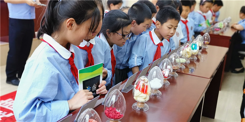 讲座结束后,干警还组织同学们观看了禁毒宣传动漫视频和公益宣传片,参观了禁毒宣传展板。在仿真毒品的展示区,同学们不时发出惊叹声:“这个像我们吃的冰糖一样,就是刚才讲座中讲到的‘冰毒’吧?”“还有这个,快看它的包装袋像不像我们平时吃的零食!”大家指着展示的仿真毒品,热烈地讨论着。