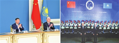 当地时间7月3日中午,国家主席习近平同哈萨克斯坦总统托卡耶夫在阿斯塔纳总统府以视频方式共同出席中欧跨里海直达快运开通仪式(拼版照片)。