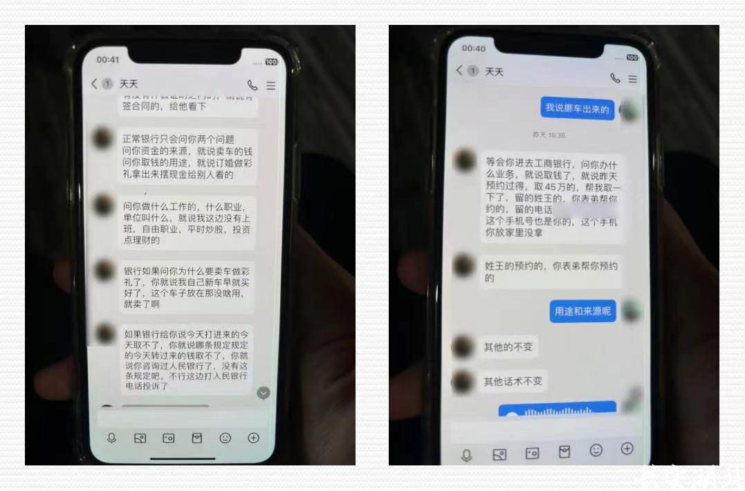 民警在游某的手机里,发现了上线教他如何在银行大额提现的话术。比如,“银行只会问你两个问题。问你资金的来源,就说卖车的钱。问你取钱的用途,就说订婚做彩礼,拿出来摆现金给别人看的。”“问你是做什么工作的?单位叫什么?就说没有上班,自由职业,平时炒股。”