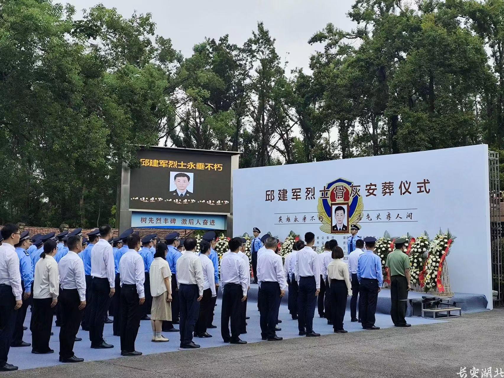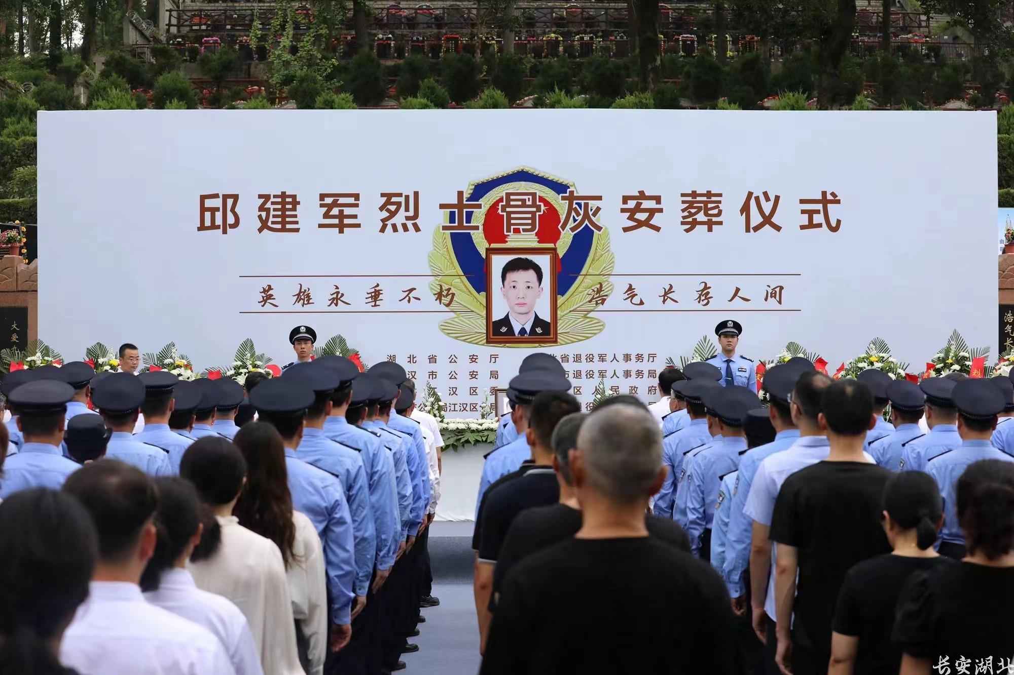 丹心为民系,浩气天地存。7月11日上午,邱建军烈士的骨灰安葬仪式在武汉市九峰山革命烈士陵园隆重举行,数百名闻讯从辖区自发赶来的群众,排成长长的队伍为之送行。“安息吧,建军!你这一生对得起这身警服!”邱建军的妻子陆英轻抚烈士墓碑泣不成声。