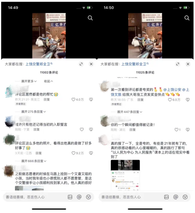 11年来 郑全卫已成为这条路上的老面孔 一些常年经过此路口的行人 总会亲切地喊他一声“老郑” 有市民说 他站在这里 就有一种安全感 经过路口的一位女士说 “他站在这里 这个路口就像有了灵魂” 在评论区,一位网友的留言 引发了大家的共情 单条留言点赞超过5万 在帮助别人的同时 郑全卫也感受着市民回馈的善意 有时候是一瓶水 有时候是一瓶饮料 有时候是一支雪糕 虽然郑全卫没有收 但他心里却无比开心 “这是大家对我工作的认可” 当得知自己被网友“表扬”上了热搜 郑全卫有些不好意思 在他看来 这些小事不值一提 就是自己的本职工作