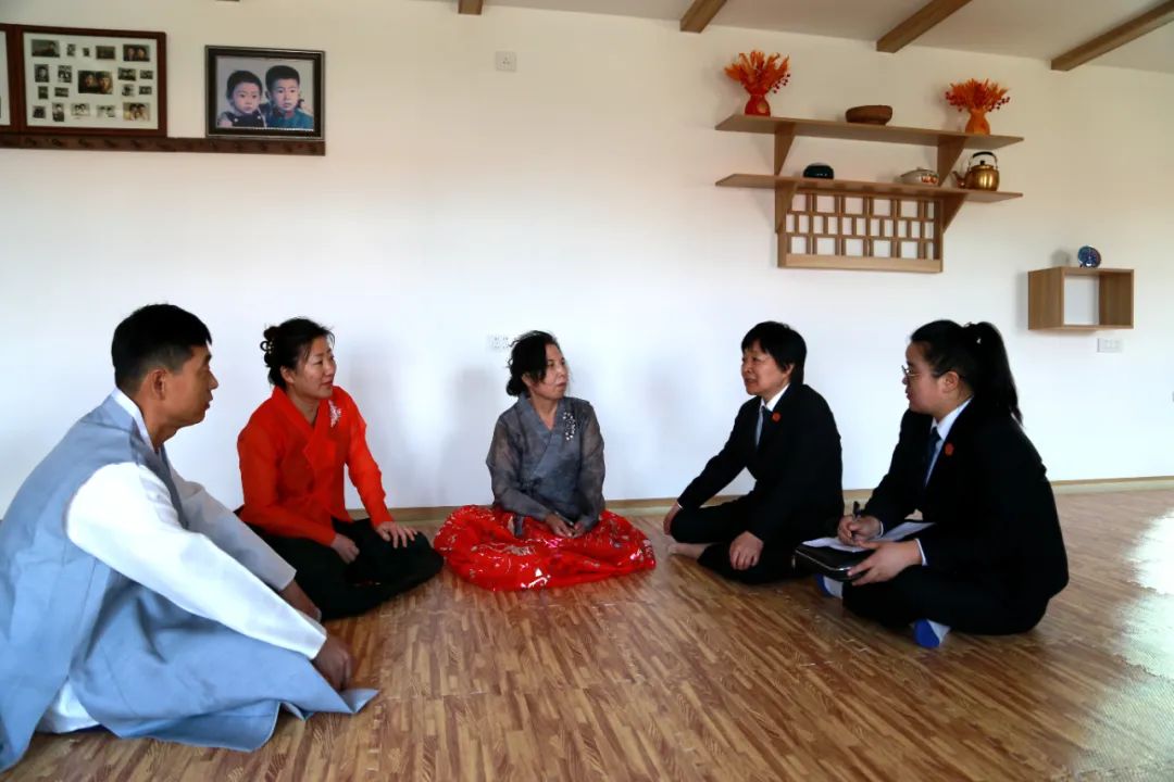 鸡林法庭法官吕仙华到朝鲜族当事人家中走访调查,通过拉家常了解情况,及时发现矛盾并就地化解,实现“家务纠纷家中断”。