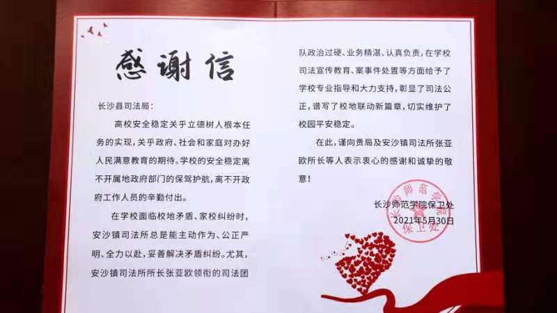 为实现由普及法律知识向提高法治素养的转变,安沙司法所每年持续开展法律进乡村、进军营、进企业、进单位活动,送法给社区矫正对象、留守儿童、空巢老人及妇女群体。“干在实处永无止境”。正如前不久长沙师范学院寄来的感谢信中写道的一样:安沙司法所“政治过硬、业务精湛、认真负责,在学校司法宣传教育、案事件处置等方面给予了学校专业指导和大力支持,彰显了司法公正,谱写了校地联动新篇章,切实维护了校园平安稳定。”长沙县司法局安沙司法所就像一台驰骋在田野上的播种机,在人民群众心中播下法治的种子,不论狂风暴雨,丽日蓝天,永远默默耕耘,静待花开!