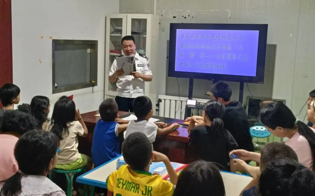 7月23日,乌鲁木齐市水磨沟区司法局华光街司法所走进斜井东社区,为辖区爱心暑假托班面向学生开展“与法‘童’行《未成年人保护法》法治宣传活动”,为社区学生开展生动有趣的法治课。工作人员分别为学生讲解未成年人保护法、民法典、国歌法、交通安全法实施条例等法律法规,引导学生将保护自己和爱护他人融于日常生活学习中,争做尊法学法守法用法的好少年。