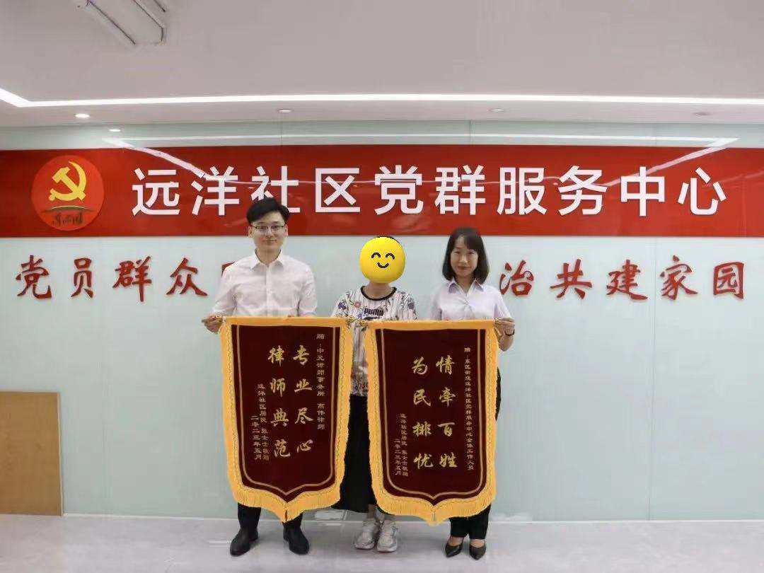 日前,远洋城天祺花园居民张女士将两面绣着“情牵百姓,为民排忧”“专业尽心,律师典范”的锦旗送到远洋社区党委马书记和驻社区法律顾问高律师手中,激动地说道:“非常感谢社区法律顾问和调解员,帮我解决了老难题”。