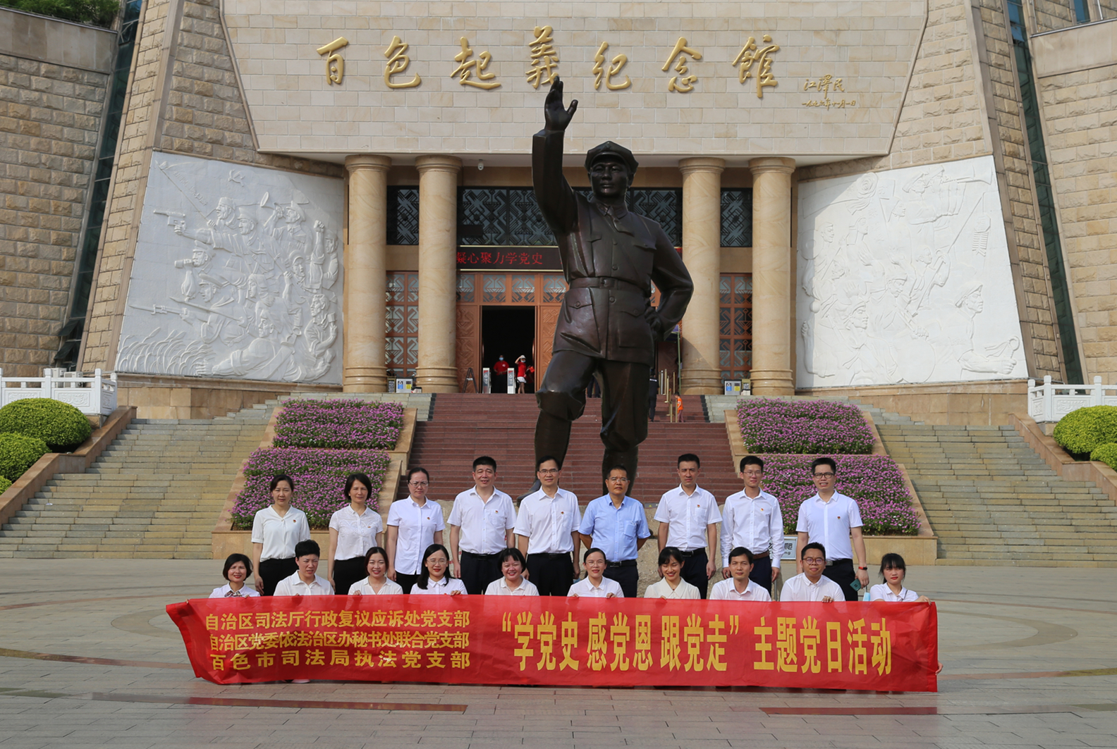 ????为深入学习贯彻习近平总书记视察广西时的重要讲话和重要指示精神,用好我区红色资源深入开展党史学习教育,按照厅党委关于党史学习教育工作部署要求,6月1日至2日,自治区司法厅复议与应诉处党支部、自治区党委依法治区办秘书处联合党支部赴百色市与百色市司法局执法监督科党支部联合开展“我为群众办实事”实践教育活动。