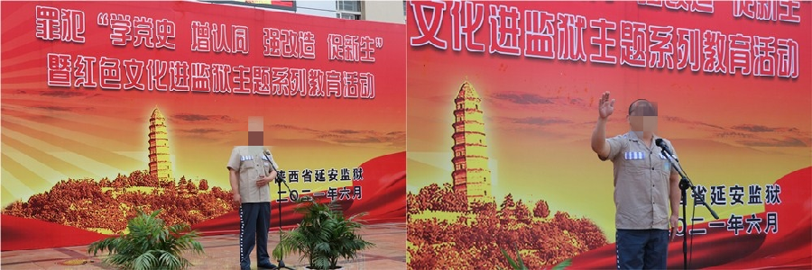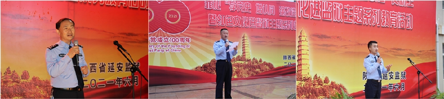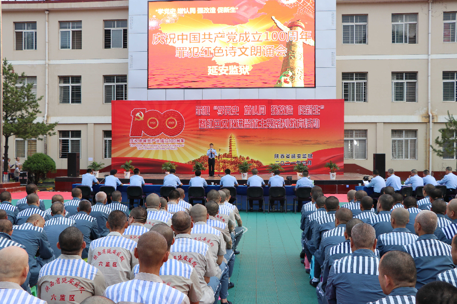 6月9日,陕西省延安监狱成功举办了“庆祝建党100周年罪犯红色诗文朗诵比赛”活动。监狱党委委员、副监狱长朱春光,第二十二批封闭执勤带班领导、企业副总经理蔡建功,管教口科长、狱内执勤警察,全体罪犯参与了现场活动。