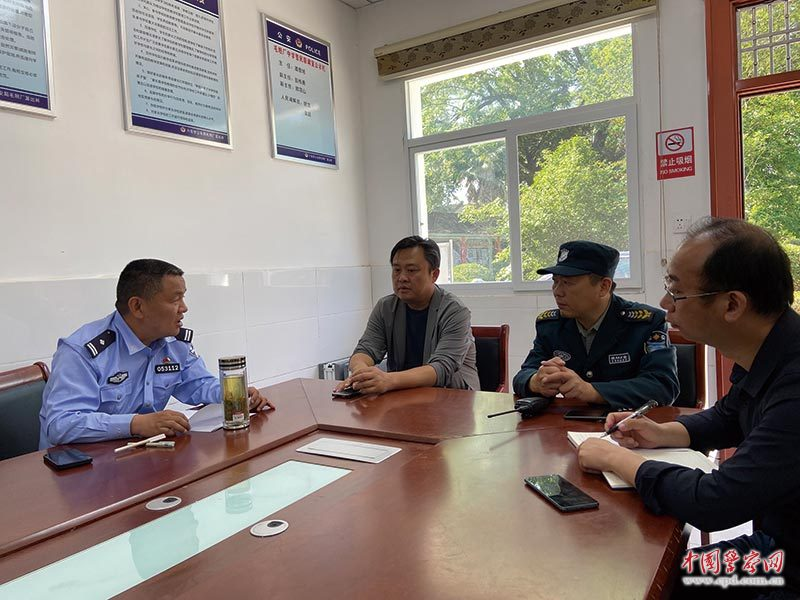 刘健(左一)和毛坦厂中学的工作人员召开警校通报会。