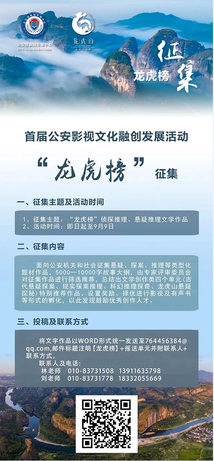 本次活动是在集合主办方核心优势之上,面向公安机关和社会征集悬疑、探案、推理等类型化创新文学作品(5000—10000字故事大纲),由专家评审委员会对征集作品进行筛选推荐,总结出文学创作类四个单元(古代悬疑探案、现实探案推理、科幻推理探奇、龙虎山悬疑探秘)特别推荐作品,设置奖励、择优进行影视及有声书等形式的孵化,以此发现鼓励优秀创作人才,并搭建起一个文化交流的平台,为文学创作者提供更广阔的展示空间和合作机会,为从业者带来内容更为丰富的资源库,形成公安题材文学、影视全链条发展机制。即日起至9月9日为作品征集阶段,9月中旬将进行专题推荐总结仪式。