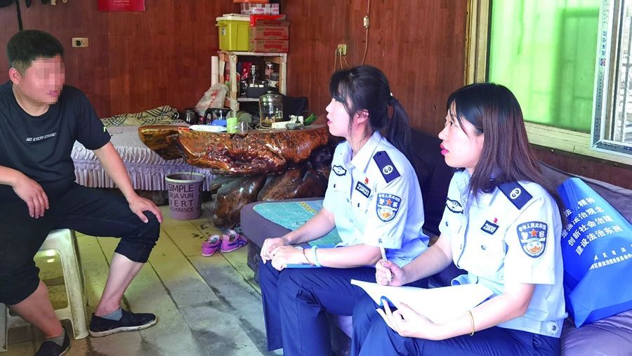 抚顺市东洲区章党(街道)司法所所长张宁(中)和同事走访辖区社矫对象
