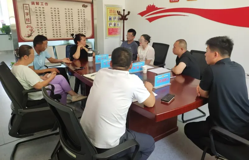 7月12日,阿孜古丽(中)组织各方商议一起群众纠纷的解决方案。