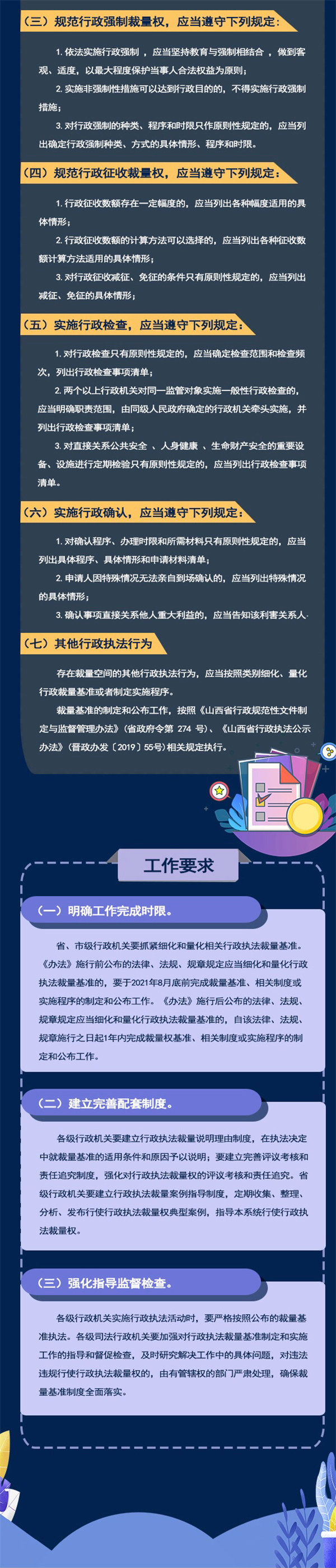 做为《山西省规范行政执法裁量权办法》的配套文件,《关于进一步规范行政执法裁量权基准制度的通知》从梳理依据、制定基准、健全制度、监督检查等环节对相关行政执法部门适用《山西省规范行政执法裁量权办法》提出了明确要求。省和设区的市级行政机关要根据工作实际,以基准控制制度来规范行政执法裁量权,建立科学明晰的行政执法裁量基准制度,进一步规范行政处罚、行政许可、行政强制、行政征收、行政检查、行政确认和其他行政执法行为,合理细化、量化裁量方式、条件、范围、种类、幅度和期限等。
