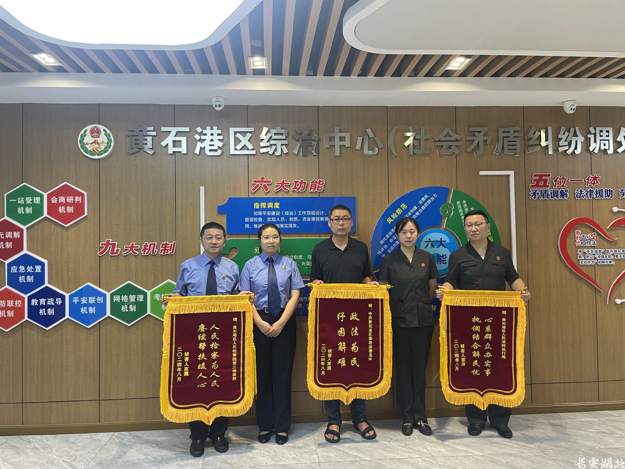 近日,因一起刑事案件,叶某甲手拿三面锦旗走进湖北省黄石市黄石港区综治中心。叶某甲是一起刑事案件被害人叶某某的家属,他匆匆而来是为了向在这里值班的区委政法委、区检察院、区法院干警分别送上锦旗以示谢意。