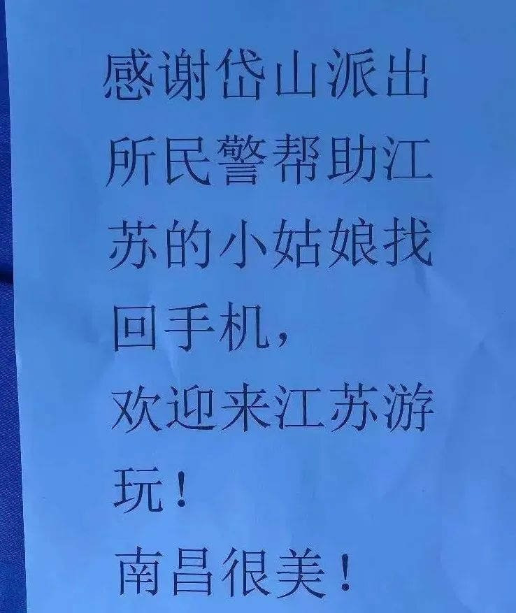 8月12日上午,辖区一年近8旬的老人欧阳先生,亲自来到南昌市青山湖分局政治处称:“我要点名表扬塘山派出所的两名警察同志,塘山派出所两名年轻警察,做的这个事情让我感到特别暖心,我一晚上都在想,怎么会有这么好的警察!”那么究竟是发生了什么事情呢? 事件经过 8月11下午14时许,青山湖分局塘山派出所接到群众李女士报警称,其在国安路一共享单车上,捡到一个黑色公文袋,内含一个黑色皮包,在周围找寻了一遍都没找到失主。李女士告诉值班民警,自己要赶着去上班,需要晚上10点30分下班后,才能将包交至派出所。 下午15时许,一位老大爷急匆匆地赶到塘山派出所,“警察同志,我的包不见了,里面有我所有的证件,我现在需要用这些证件办急事,你们可以帮我找一下嘛?”值班民警罗俊涛、辅警何东云耐心地安抚老大爷情绪,并询问其丢包的过程以及其个人身份信息,经过信息比对,幸运的是,被热心市民李女士捡到的包的失主,正是这位老大爷——欧阳先生“老人家别着急,您的包已经被一个热心女士捡到了,她现在正在上班,需要晚上近11点才能下班,等她下班之后我们再联系您。”听闻自己的包被热心群众保管了,欧阳先生终于松了口气。 当晚22时许,待李女士下班后民警罗俊涛、辅警何东云,立即驱车将手提包取回“老人家,您的包我们拿到了,您年纪也大了,不用亲自跑过来了,我们给您送家里去。” 随即,民辅警将包送至南京东路高新住宅小区,交还失主欧阳先生手中,“两位年轻的警察同志,你们这样做,真正体现了人民公安爱人民,为民办实事办好事,真的太让我暖心了!”欧阳先生确认包内物品无误后 连连对民辅警称赞道。 令欧阳先生没想到的事,自己的这点小事,民警会如此上心还特意送包上门,这让欧阳先生感到十分暖心,激动的一晚上没有睡好。第二天,欧阳先生便迫不及待来到青山湖分局政治处,想用自己的方式,向帮助他的两位民警点名表扬。 为民警罗俊涛、辅警何东云,以及热心市民李女士,点赞! 同样发生在南昌 一位来自江苏的小姑娘说: “南昌很美!” 近日,来自江苏的小姑娘傅某来到青云谱区八大山人梅湖景区游玩,发现自己的手机不慎丢失,因为手机里存有重要信息,心急如焚的她拨打了报警电话。 南昌市青云谱区岱山派出所接警后立即开展工作,民警将傅某接到了派出所,详细询问了她丢失手机的时间、地点、周围环境等信息。根据这些信息不断寻找线索,功夫不负有心人,经过2个多小时的调查,终于发现一骑电动车的男子在某学校门口捡到了疑似傅某遗失的手机。民警再接再厉,很快又确认了男子的身份,通过联系,男子表示正在南昌县工作,一时不方便过来。于是民警带着傅某前往南昌县,在男子工作地见面,经过现场确认,男子捡到的手机正是傅某遗失的那部。 手机找回后,傅某非常激动,她感谢民警不仅认真负责,热情服务,而且效率很高。第二天,没想到已回家的傅某又向派出所寄来了感谢信——“感谢岱山派出所民警帮助江苏的小姑娘找回手机,欢迎来江苏游玩!南昌很美!” 南昌景美人更美 欢迎全国游客来到南昌游玩 公安机关将竭诚为大家服务 为“网红”南昌保驾护航 办好“小事情”收获“大认可” 为热心市民和民辅警们点赞