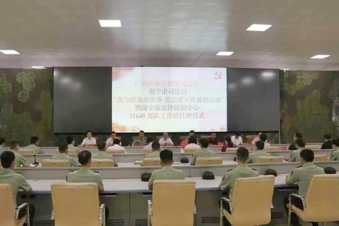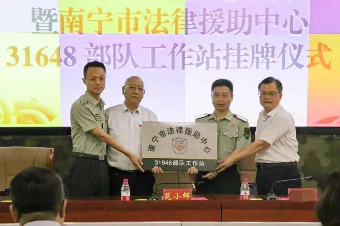 ????6月17日上午,自治区司法厅、南宁市司法局举行“我为群众办实事 送法进军营双拥活动”暨南宁市法律援助中心31648部队工作站挂牌仪式。自治区司法厅党委委员、副厅长、一级巡视员范小辉与南宁市司法局领导、31648部队领导共同为工作站挂牌。