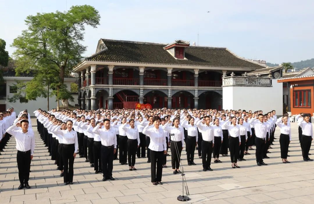 夏日的遵义,一派生机盎然,遵义会议会址在阳光照耀下熠熠生辉。上午9时,活动正式开始,全场肃立、奏唱国歌。面对鲜艳的党旗,谌贻琴带领新党员举起右拳庄严宣誓:“我志愿加入中国共产党,拥护党的纲领,遵守党的章程,履行党员义务,执行党的决定,严守党的纪律,保守党的秘密,对党忠诚,积极工作,为共产主义奋斗终身,随时准备为党和人民牺牲一切,永不叛党。”铿锵有力的宣誓,响彻会址上空。新党员代表作了发言,表示将用毕生精力践行庄重宣誓,奋力书写好时代答卷。