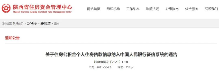 6月21日,省住房资金管理中心发布通告指出,自7月8日起,陕西省住房资金管理中心个人住房公积金贷款信息将纳入中国人民银行征信系统。