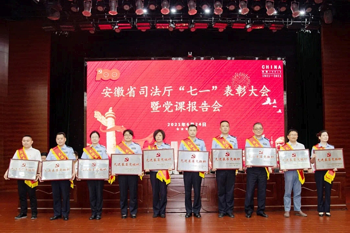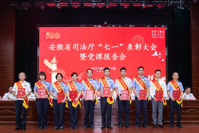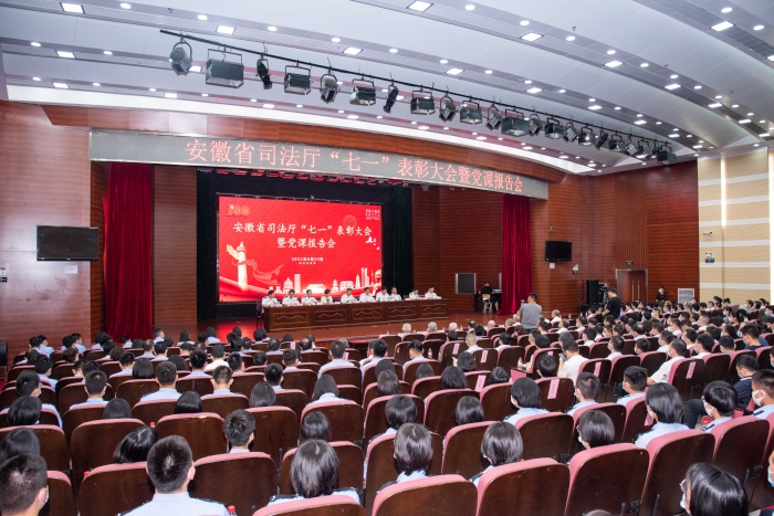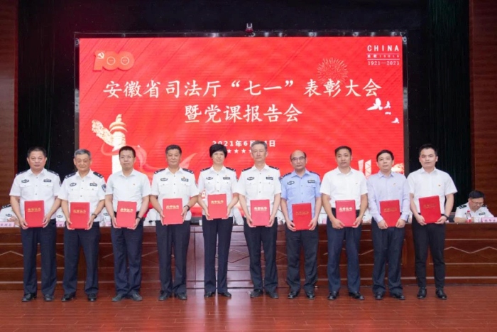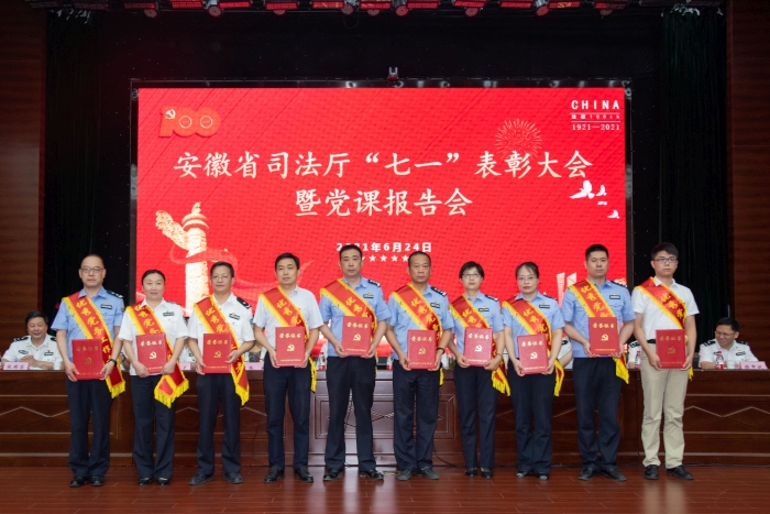6月24日,安徽省司法厅召开“七一”表彰大会暨党课报告会。厅党委书记、厅长姜明出席会议并作党课报告,厅党委委员、副厅长张国安主持会议。在家厅领导张敏、李军以及省监狱局、戒毒局、警官学院主要负责人出席会议。